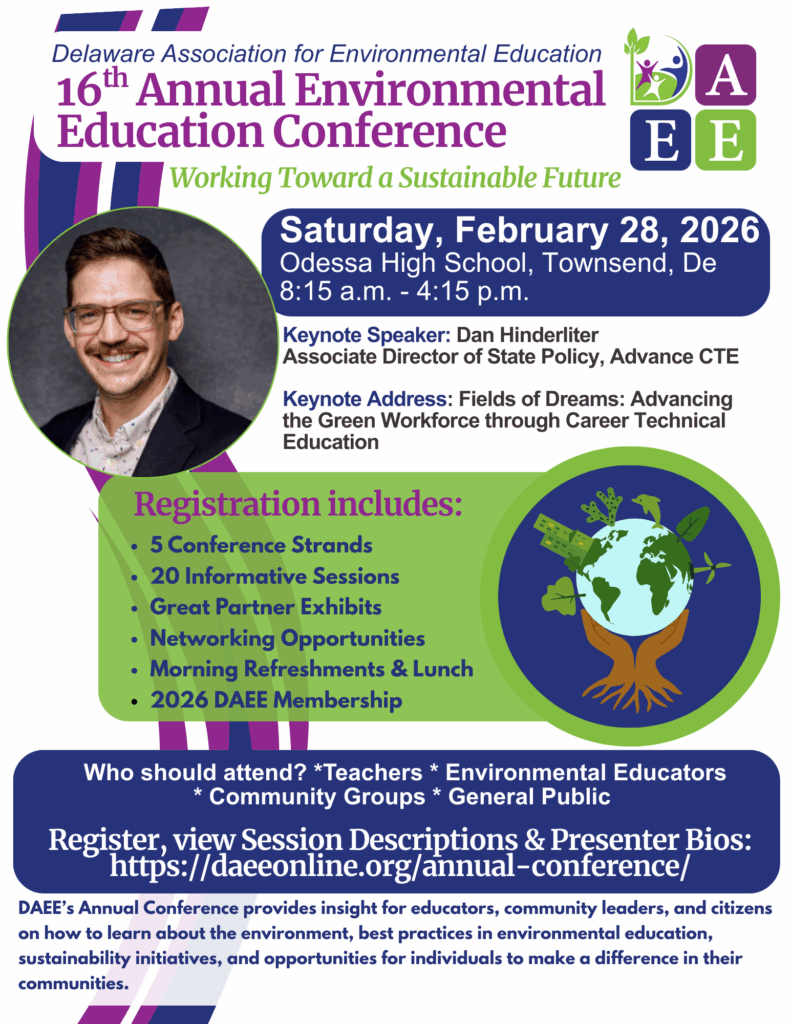 The DAEE conference is a yearly opportunity for formal and non-formal educators, community and scout leaders and anyone else sharing the desire to help all communities in Delaware connect to nature. It is a day of networking, professional development, sharing, and hands-on experiences. Throughout the day we explore environmental education opportunities, resources, best practices, and local issues to help foster environmental stewardship.